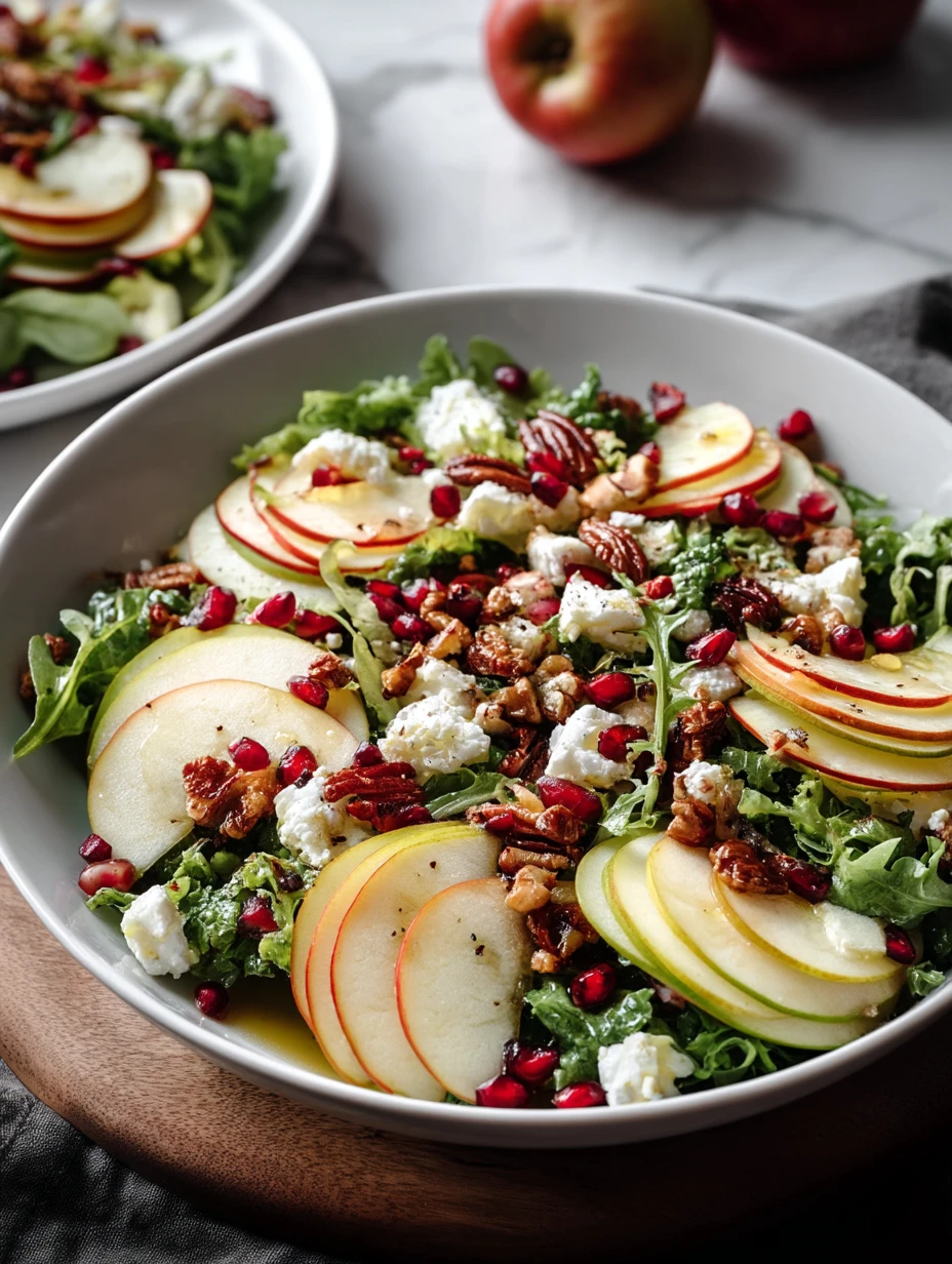 Each bite of this salad brings a medley of textures and tastes: the sweet crunch of apple, the creamy crumble of feta, the toasty nuttiness of walnuts, and the juicy pop of pomegranate. Tossed in a light honey vinaigrette, it’s the kind of dish that feels indulgent while being wonderfully wholesome.