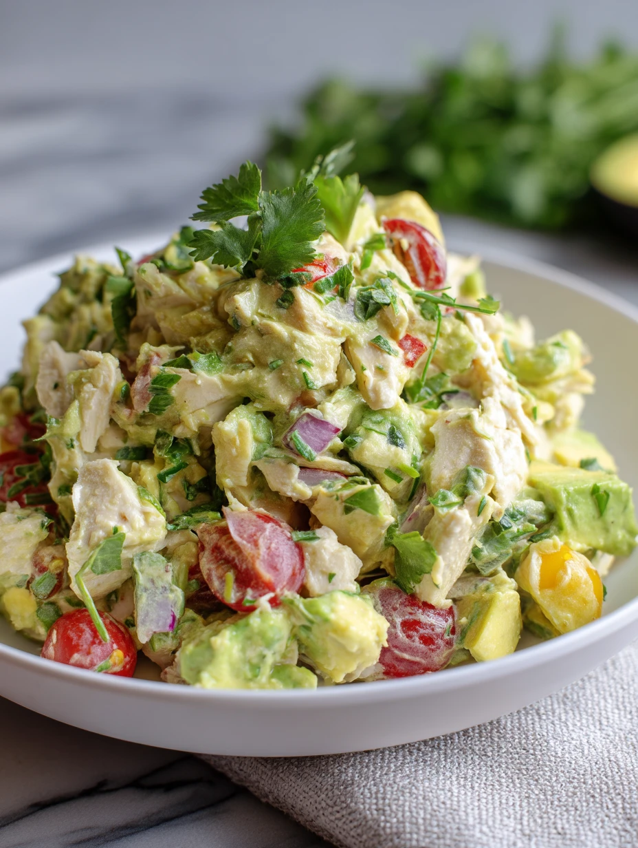 Creamy, fresh, and full of vibrant textures, this Avocado Chicken Salad is your go-to for a satisfying meal that feels indulgent yet nourishing. With tender shredded chicken, ripe avocado, crunchy red onion, and bursts of juicy tomato, this salad doesn’t just deliver on flavor—it fills you up in the most wholesome way. Whether you’re prepping lunch ahead or whipping up a light dinner, this salad hits the sweet spot of quick, healthy, and delicious.