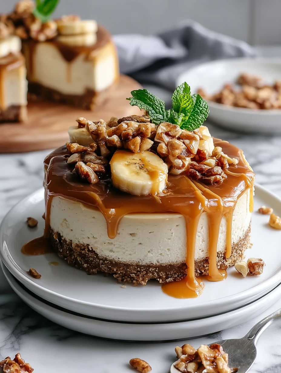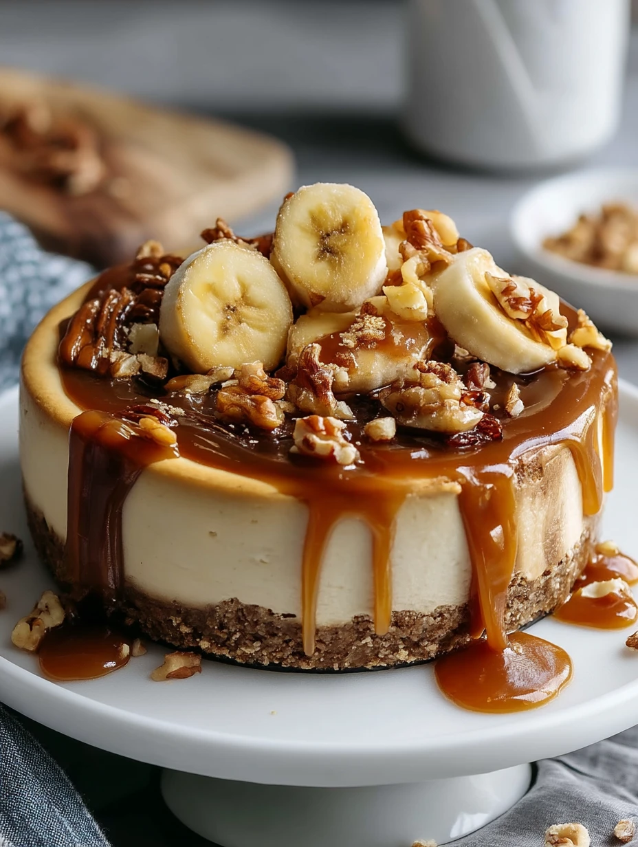 If you’re the kind of person who always “accidentally” buys too many bananas, this is the dream dessert you’ve been waiting for. Imagine a silky baked cheesecake perfumed with real banana, crowned with rivers of glossy caramel and a generous tumble of toasted nuts for crunch.