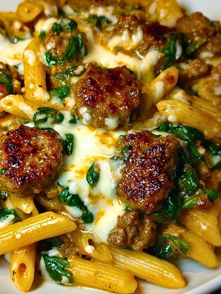 This ultra-comforting pasta dish delivers bold meaty flavor and rich creamy texture in every bite. Juicy Italian sausage and savory ground beef are combined with penne pasta, wilted spinach, and a silky garlic butter cream sauce—topped with melty cheese for the perfect finish. Whether you’re feeding a family, meal prepping for the week, or just craving comfort food, this hearty dish checks all the boxes. It’s quick, satisfying, and packed with high-protein goodness. Perfect for fans of easy dinner ideas, creamy pasta dishes, and flavor-packed food ideas that reheat beautifully.