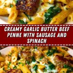 Creamy Garlic Butter Beef Penne with Sausage and Spinach