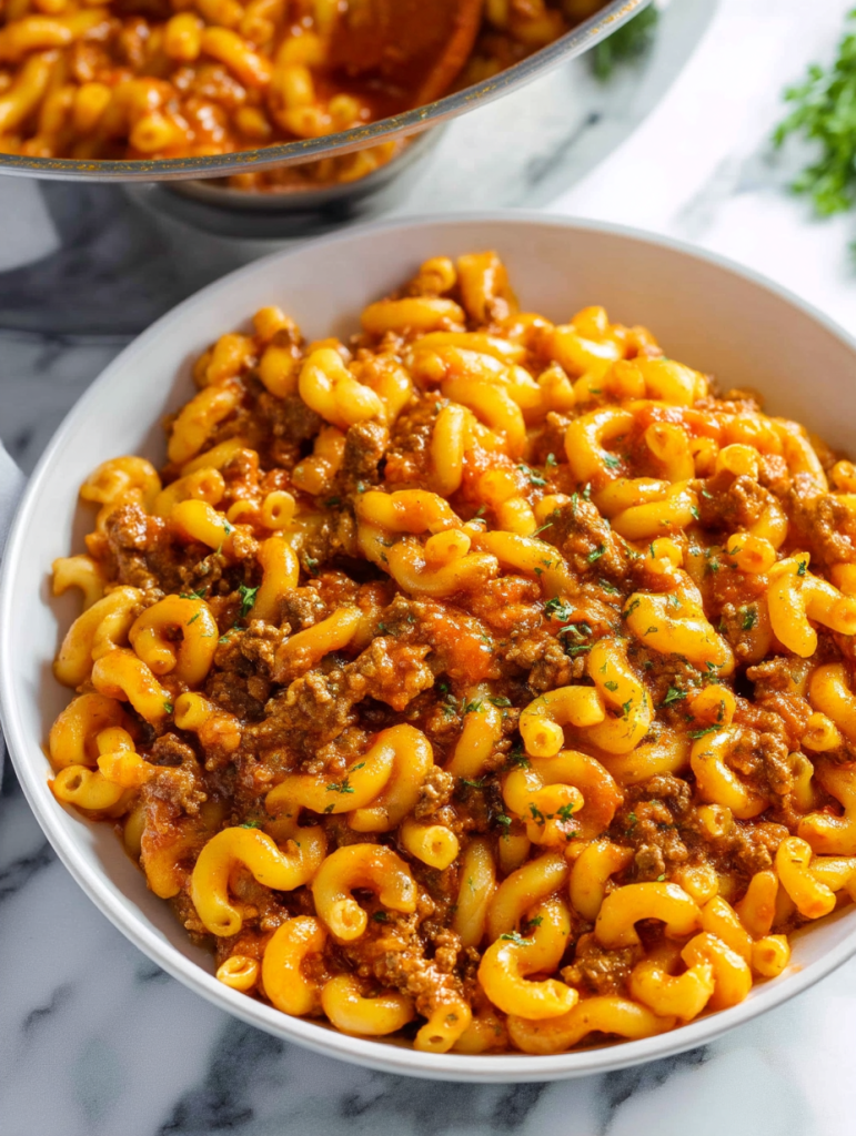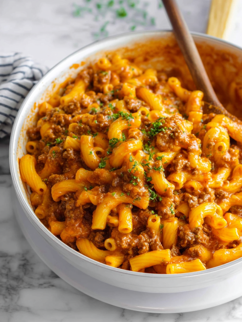 Elbow macaroni is the classic choice because its curved shape catches all that cheesy meat sauce. But if you’re out, don’t stress. Shells, penne, or rotini all work beautifully too. Just be sure to use a pasta shape that holds up well and has enough surface area to cling to the sauce.