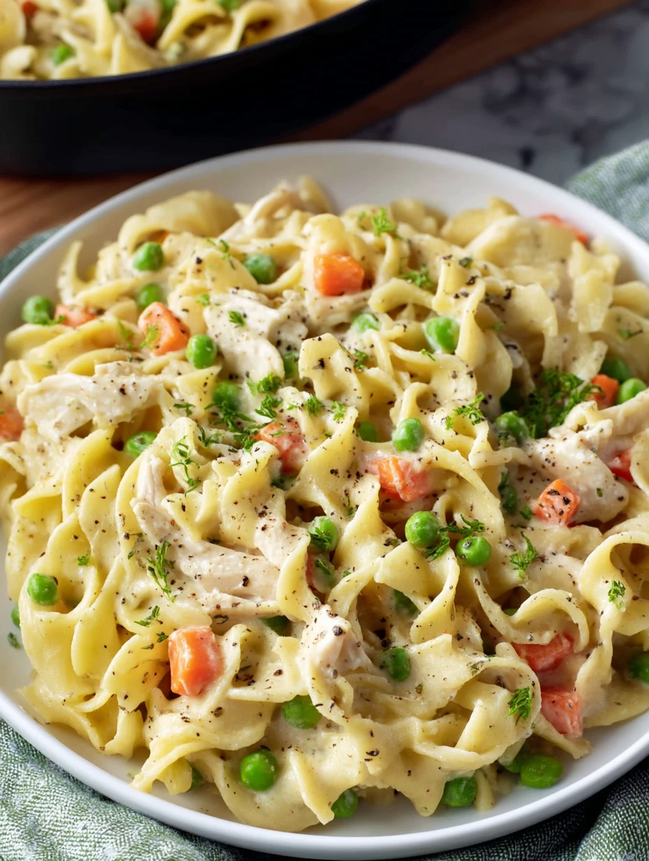 Creamy, comforting, and loaded with the flavors of a classic chicken pot pie, these Chicken Pot Pie Noodles are a cozy weeknight dream in a skillet. With tender egg noodles, juicy shredded chicken, and a rich, creamy sauce filled with sweet peas and carrots, this dish delivers all the heartwarming goodness of pot pie without the crust.