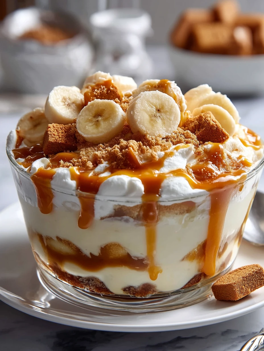 Spoon a thin layer of caramel sauce into the bottom of your trifle dish. Add an even layer of Biscoff cookies, then a layer of banana slices. Spread a generous layer of the Biscoff pudding mixture over the bananas, smoothing it with an offset spatula.