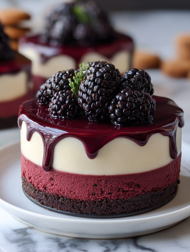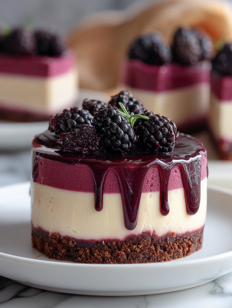 Fresh blackberries offer the best flavor and texture for garnishing and blending into the mousse. However, frozen blackberries can also be used for the mousse layer if they are thawed and drained well. Just avoid canned blackberries, as they often lack flavor and have too much syrup.