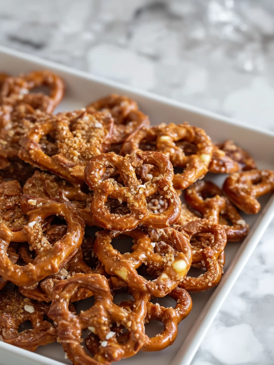 Picture a tray of golden pretzels, caramelized with a warm toffee glaze and topped with a sprinkle of sea salt for that irresistible finish. It’s the kind of snack that vanishes in minutes – so consider making a double batch. Trust us, one handful just isn’t enough.