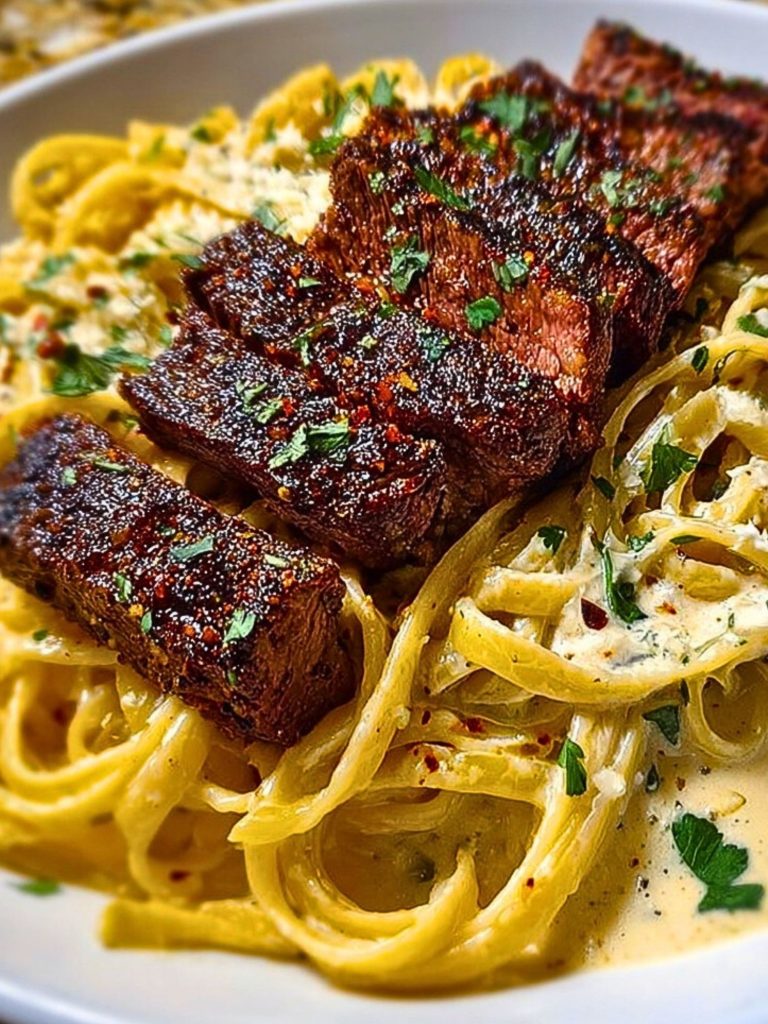 This dish has all the comfort of creamy pasta, elevated with tender slices of Cajun-rubbed steak that sizzle in garlic butter until they form a perfect crust. It’s rich, quick to make, and packed with flavor from the very first forkful.