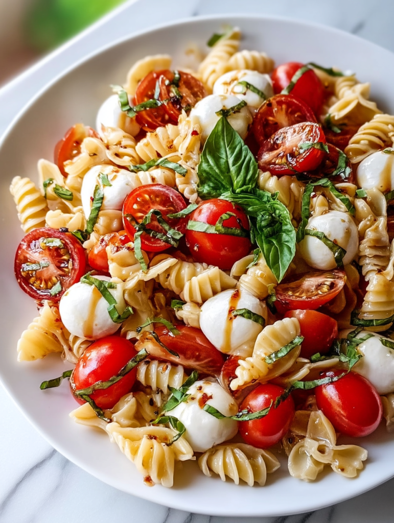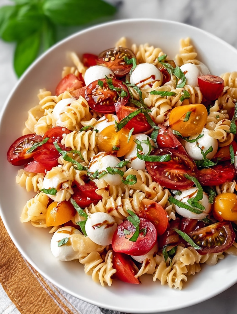 Nothing says summer like this vibrant Caprese Pasta Salad. Bursting with sweet cherry tomatoes, creamy mozzarella pearls, and fragrant basil, it’s a refreshing yet satisfying dish that’s perfect for picnics, cookouts, or quick weekday lunches. Tossed with a drizzle of balsamic glaze and olive oil, this colorful pasta salad is a great go-to for light dinner ideas, quick lunch options, and easy recipes that make healthy snacks feel indulgent. Whether you’re looking for a new crowd-pleaser or exploring simple food ideas, this dish has you covered.