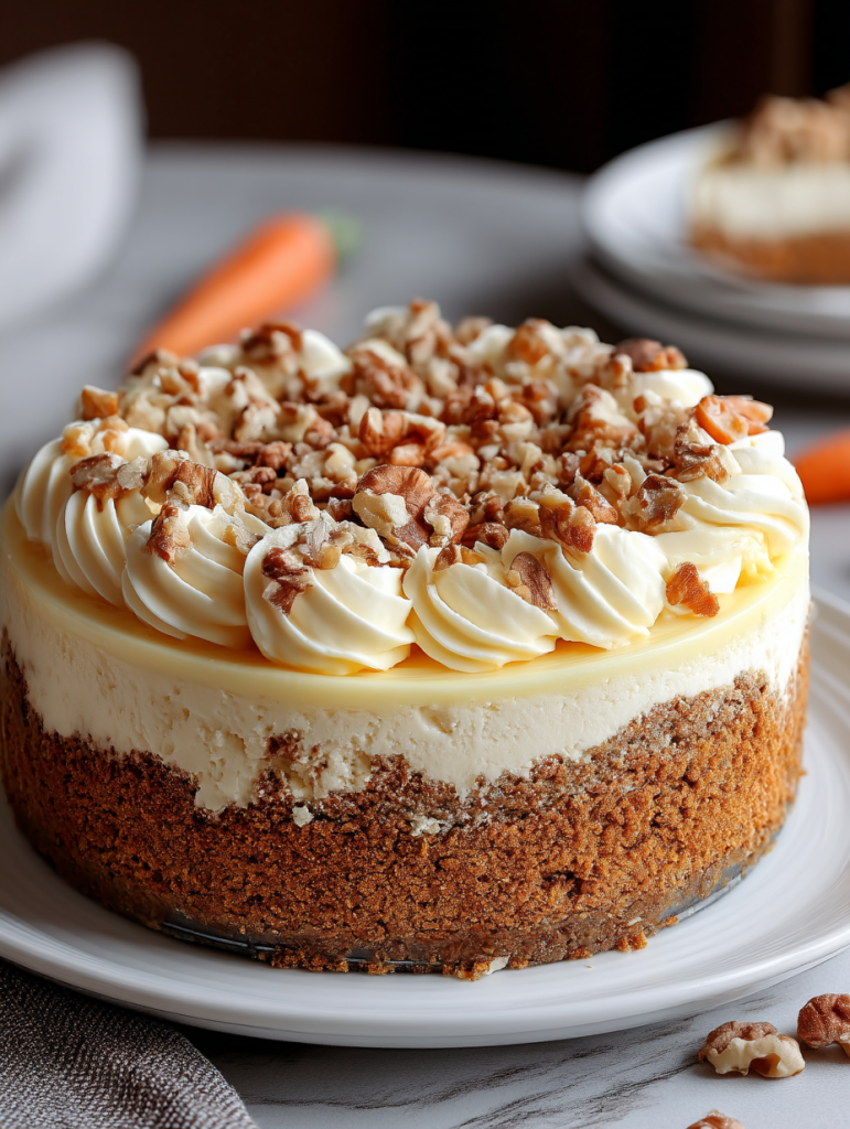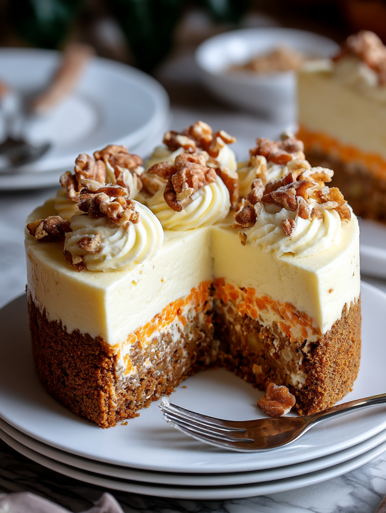 This cake isn’t just stunning to slice into—it’s layered with flavor and texture. You get that moist, nutty carrot cake base with warm spices like cinnamon and nutmeg, paired with silky cheesecake and topped with an indulgent cream cheese whipped topping. Each forkful feels like a celebration.