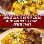 Keywords: garlic steak pasta, cheesy pasta recipe, four-cheese rigatoni, easy steak dinner, comfort food pasta