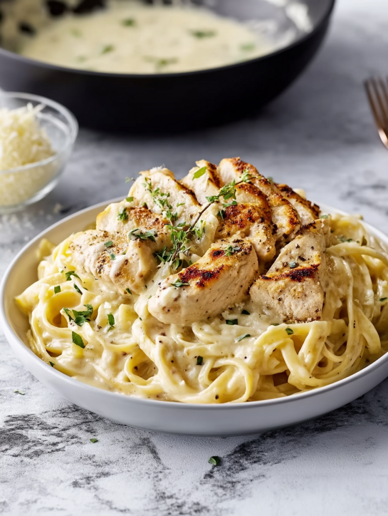 6. Plate the pasta and top with sliced chicken. Garnish with parsley and extra Parmesan if desired.