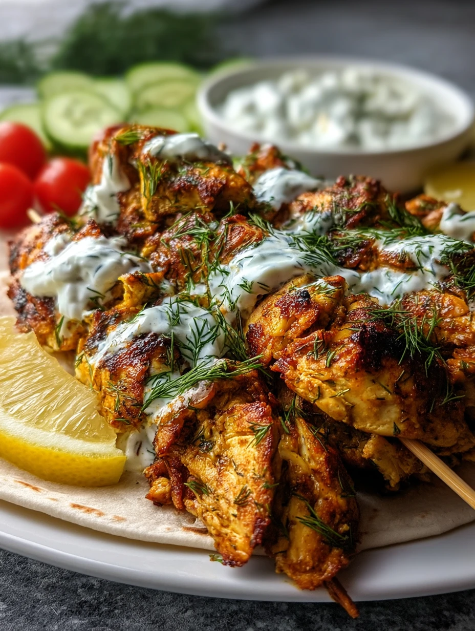 While the chicken marinates, stir together Greek yogurt, minced garlic, chopped dill and mint, lemon juice, salt, and a touch of olive oil. Keep refrigerated until ready to serve.