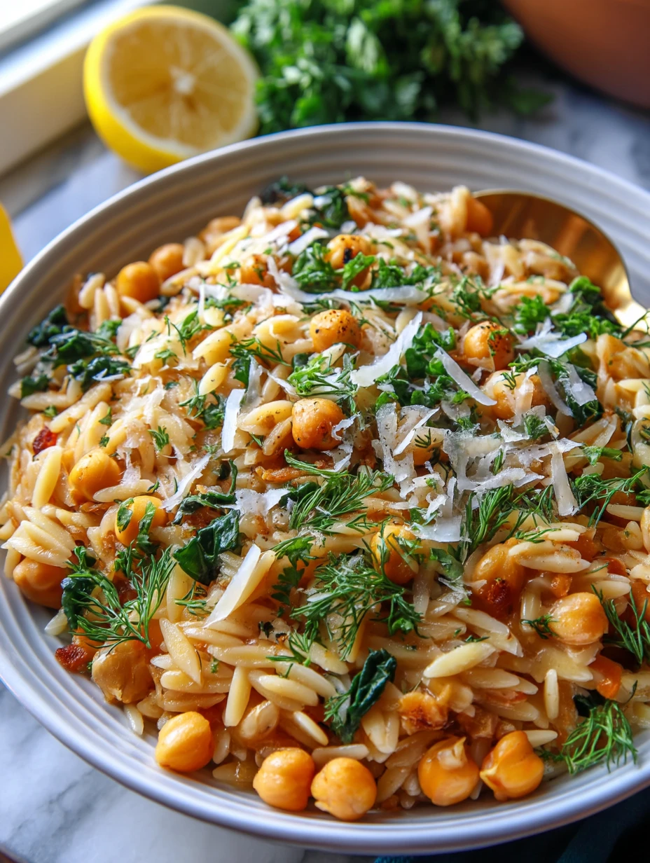 8. Let the Chickpea Orzo sit for 2 to 3 minutes to thicken, then serve warm with extra Parmesan, fresh herbs, and lemon wedges if you like.
