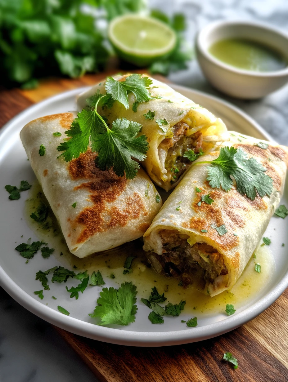 Warm the remaining green sauce and spoon it over or alongside the burritos. Finish with chopped cilantro and serve while hot so the cheese stays melty and the tortillas stay crisp.