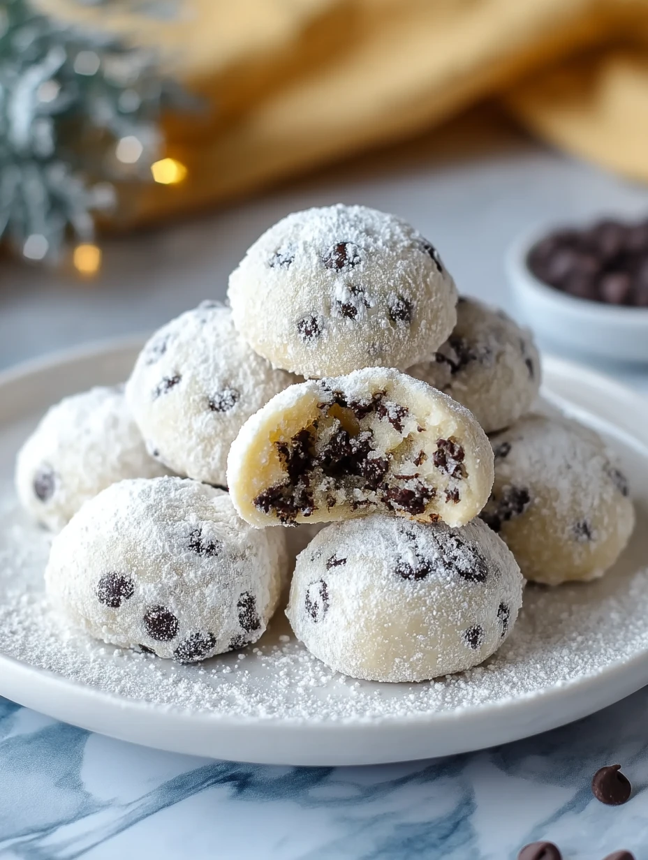 These Chocolate Chip Snowball Cookies are the perfect blend of rich chocolate and buttery cookie wrapped in a cloud of powdered sugar. Each bite melts in your mouth, revealing a soft center packed with semi-sweet chocolate chips and delicate vanilla notes.