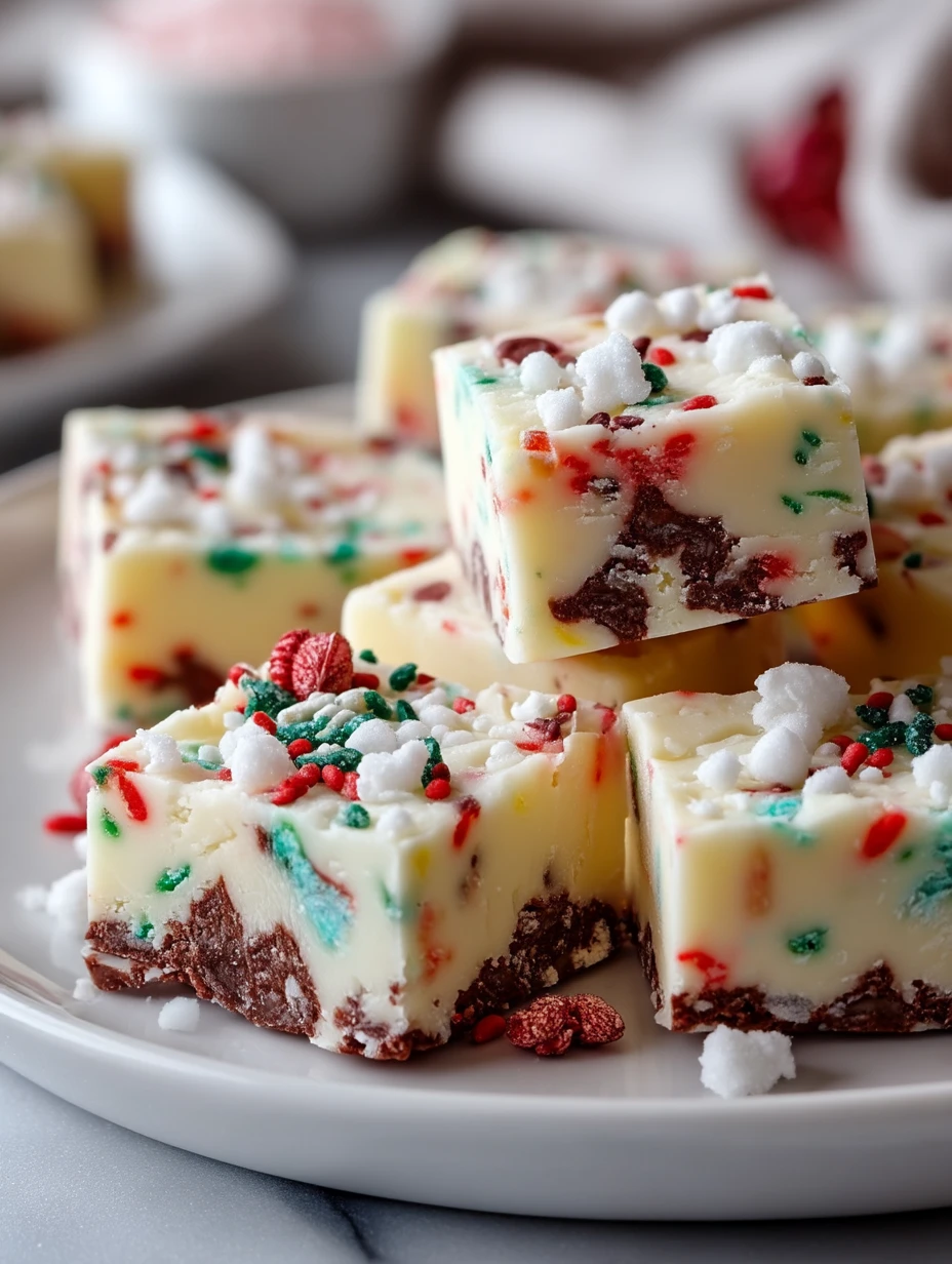 A touch of vanilla keeps the top layer tasting soft and bakery-like, while the chocolate base adds depth and balance. Together, the layers create a bite that is creamy, fudgy, and just festive enough to stand out among cookies, bars, and candies.