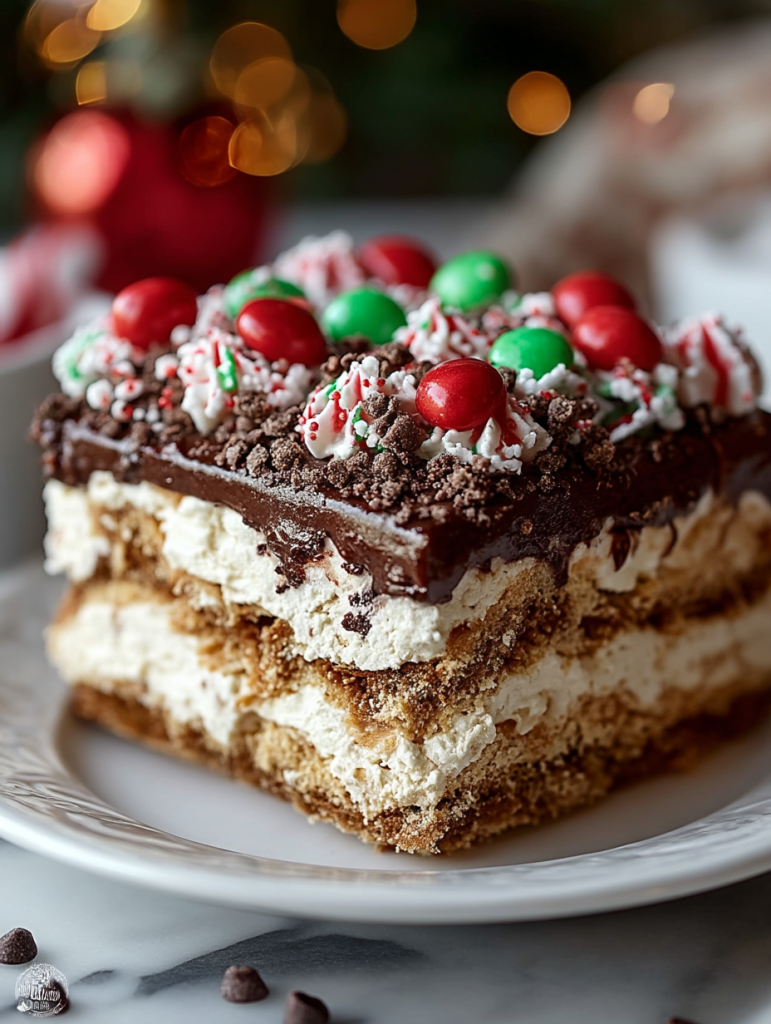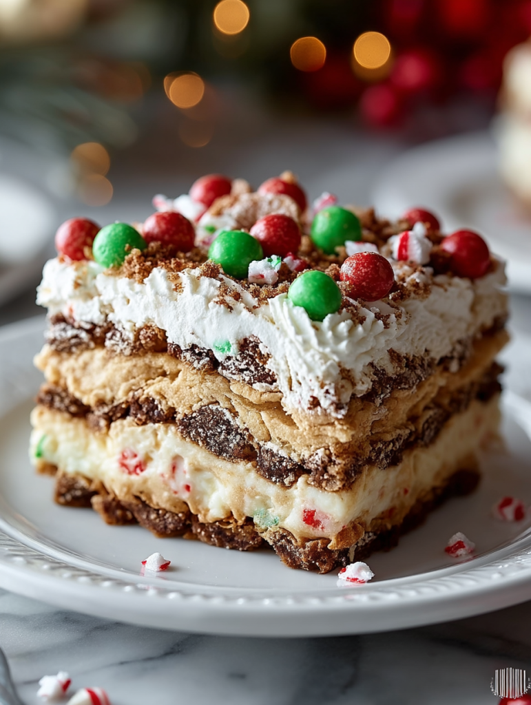 Keywords: Christmas dessert, no-bake holiday dessert, Christmas cookie lasagna, festive dessert, easy holiday recipes