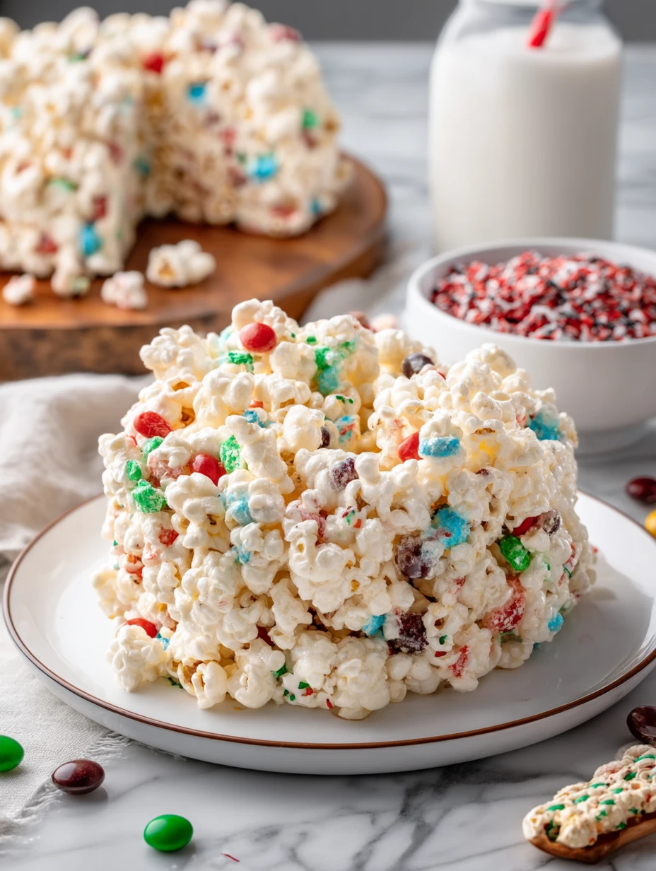 Plain, air-popped popcorn works best for this recipe because it allows the marshmallow coating and candy flavors to shine. Avoid buttered or heavily salted popcorn, as it can interfere with the sweetness and texture of the cake. If you’re using microwave popcorn, make sure to pick a low-sodium, unflavored variety.