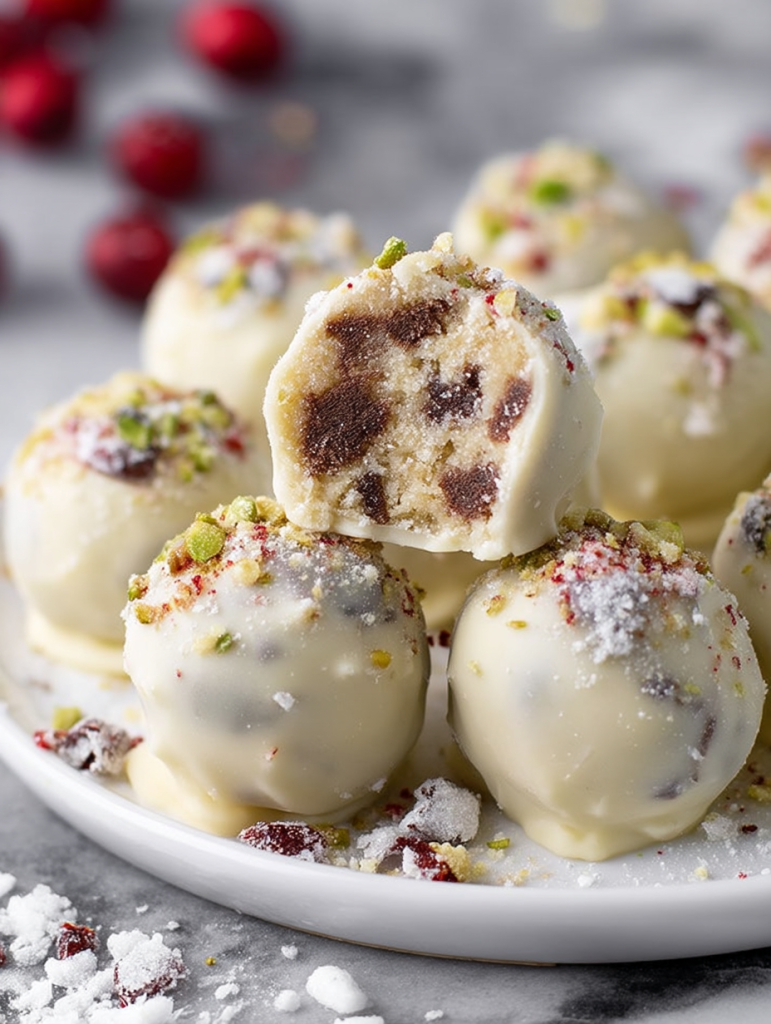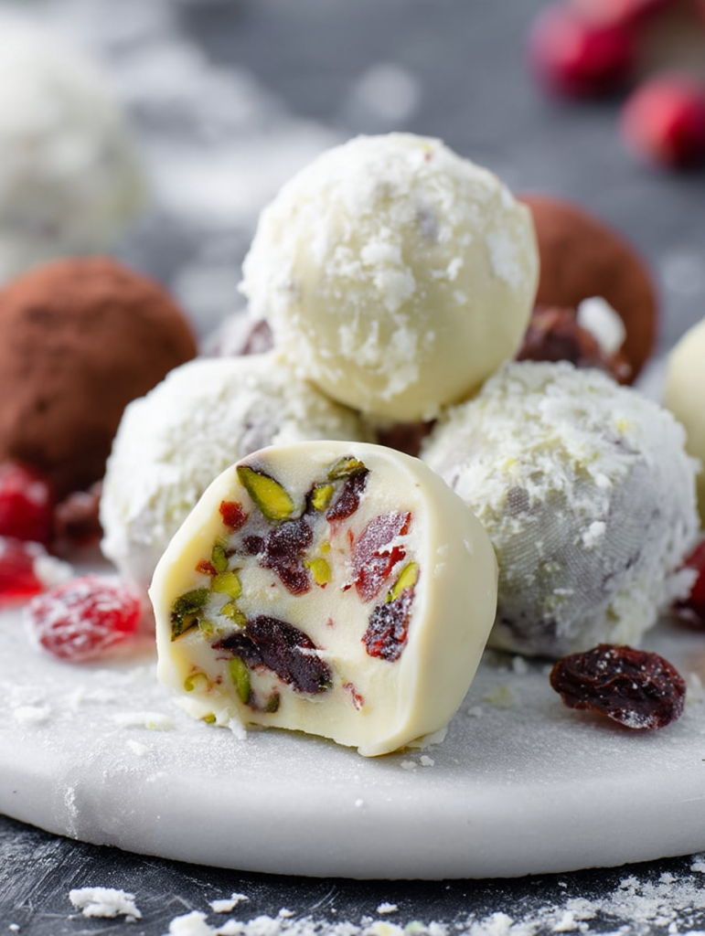 These creamy, snowy-white Christmas Truffles are little bites of holiday magic. Speckled with tart cranberries, crunchy pistachios, and sweet white chocolate, they deliver the perfect balance of festive flavor and texture in every bite. Whether you’re hosting a party, creating edible gifts, or just want a wintry treat for yourself, these truffles are easy to make and impossible to resist.
