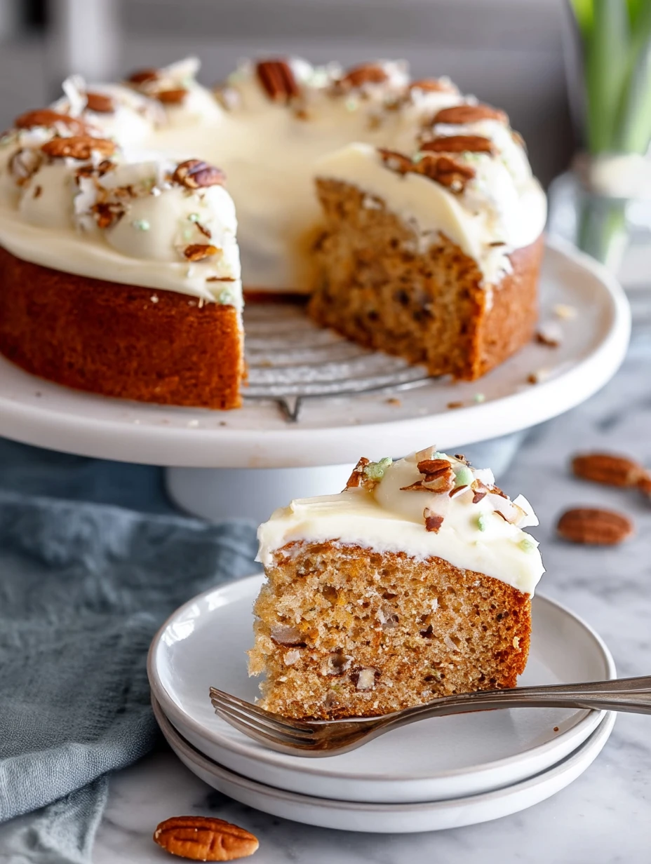 This cake checks so many boxes for spring baking. It is easy to mix together, it stays wonderfully moist, and it looks impressive without needing complicated decorating skills. The combination of banana, pineapple, coconut, and pecans gives it a layered flavor that feels homemade and special.