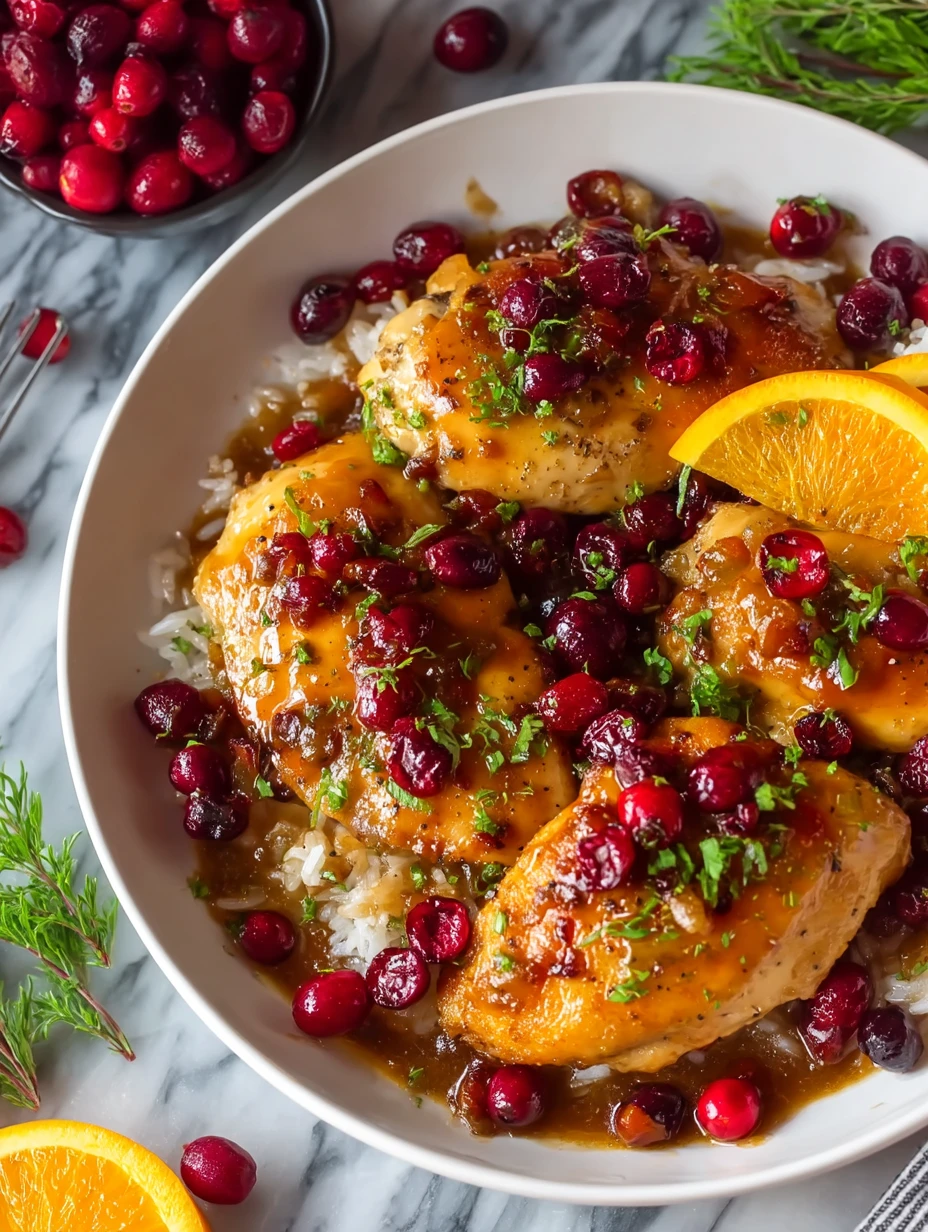 This chicken is everything you want in a cold-weather dinner: easy, flavorful, and stunning. The naturally tart cranberries soften into the sauce while orange juice and zest add freshness. The sauce thickens into a rich glaze that clings to each piece of chicken, making every bite incredibly juicy and satisfying.