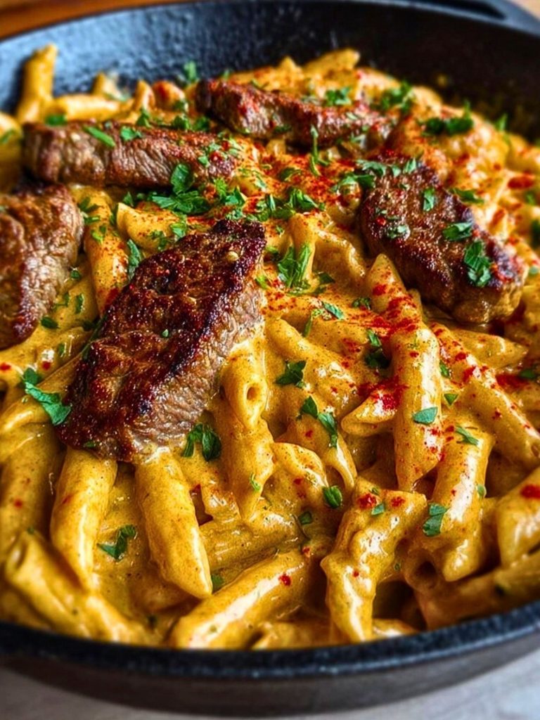 Top with the sliced steak, sprinkle with fresh parsley, and give it a final dusting of Cajun spice. Serve warm and savor every creamy, spicy bite.