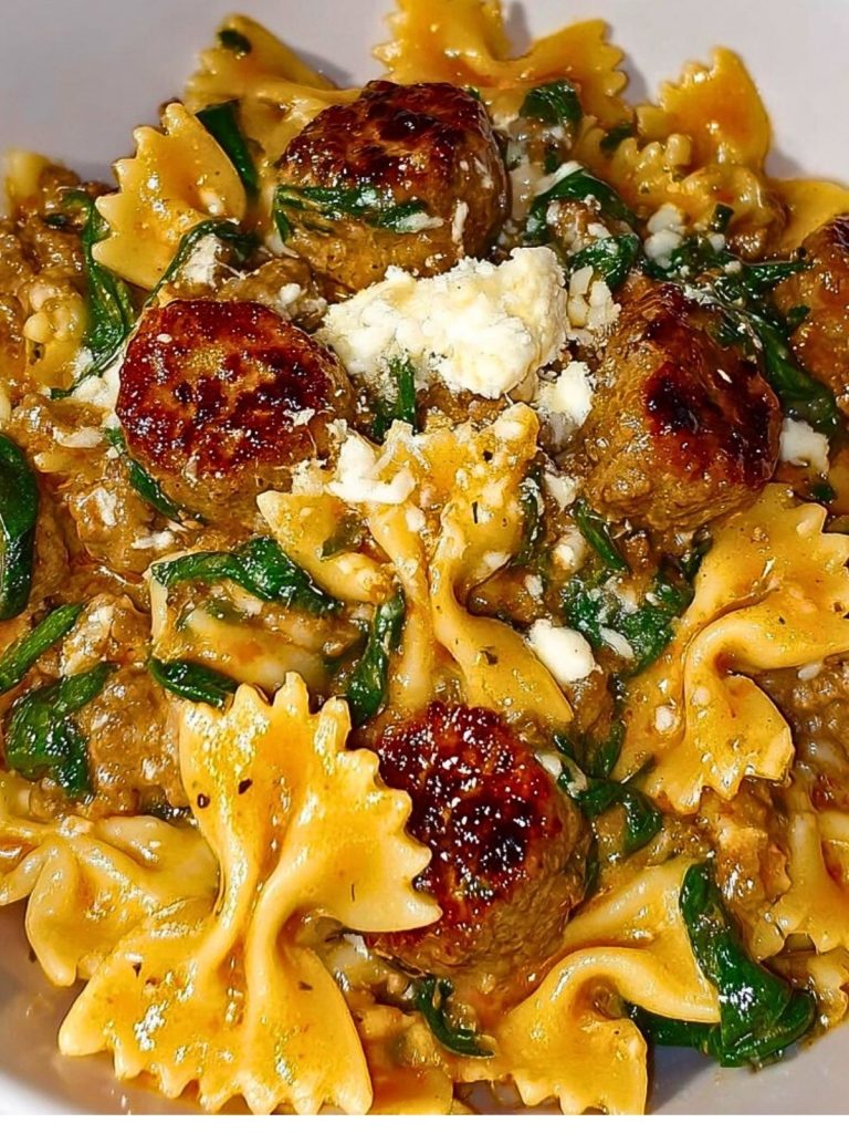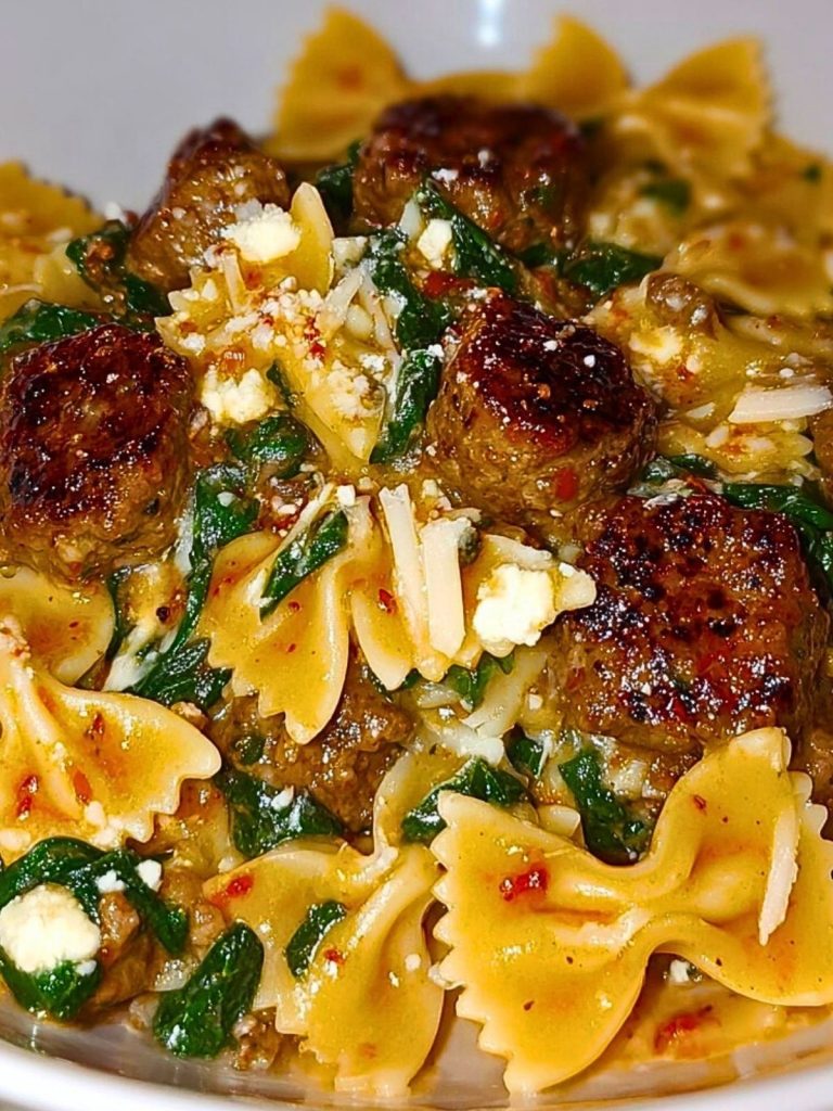 This Creamy Garlic Butter Beef Bowtie Pasta with Italian Sausage & Spinach is a rich and hearty meal that blends tender pasta, savory Italian sausage, and juicy beef chunks in a luscious garlic butter cream sauce. Wilted spinach adds a vibrant green touch, while tangy crumbles of feta or parmesan elevate each bite. It’s the kind of dinner that wraps you in cozy, comforting flavor—like a warm hug from the kitchen.
