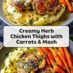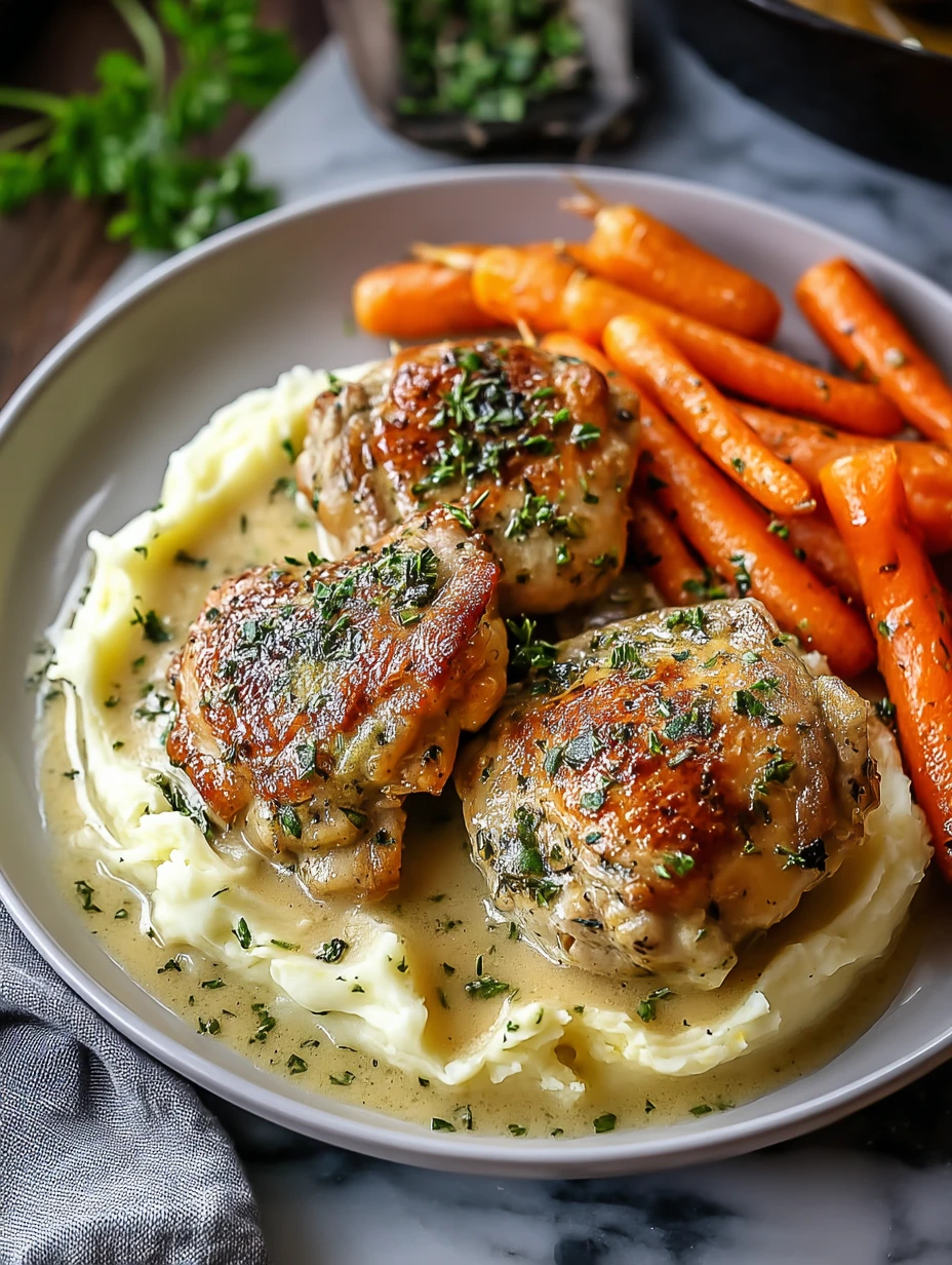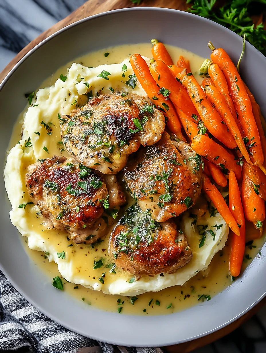 Golden-seared chicken thighs bathed in a creamy garlic herb sauce, served over buttery mashed potatoes and tender glazed carrots – this dish is a cozy, comforting dinner that brings restaurant-quality flavor right to your home kitchen. Each bite of juicy chicken is smothered in a velvety sauce with hints of thyme, parsley, and garlic, making it a satisfying and complete meal on one plate.