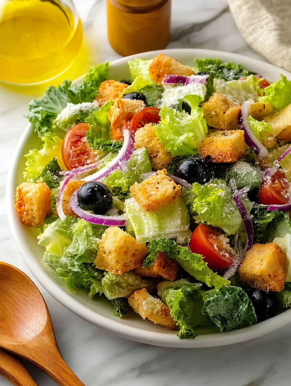 The magic is in the balance. You have cold, crisp romaine as the base, salty olives and Parmesan for depth, tomatoes for sweetness, red onion for bite, and pepperoncini for that signature tang. Then the creamy dressing ties everything together while the croutons bring the final crunchy finish.