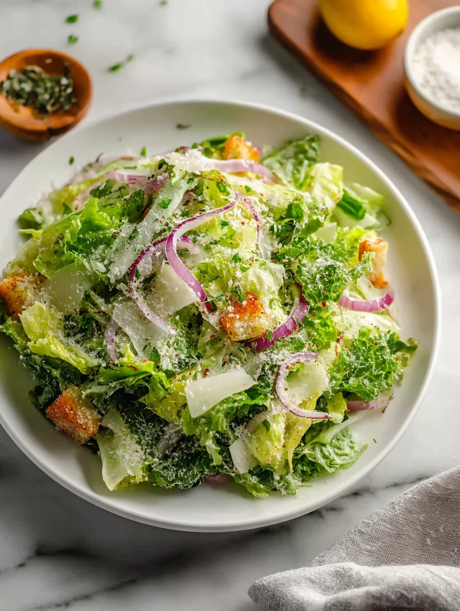 This is the salad I reach for when I want something fast, flavorful, and dependable. It works as a quick lunch, a fresh dinner side, or a light dish to bring to the table when heavier mains need balance. The texture is what really wins me over here: cool lettuce, delicate onion, and plenty of Parmesan in a salad that tastes both clean and satisfying.