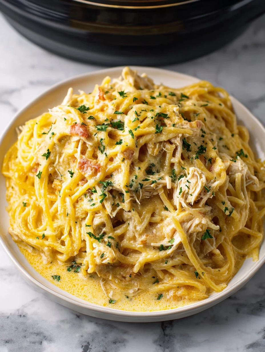 Instead of juggling multiple pans and a baking dish, everything but the pasta cooks low and slow in the crock pot. The chicken becomes fork‑tender, the flavors have time to meld, and all you do at the end is stir in hot spaghetti and extra cheese.