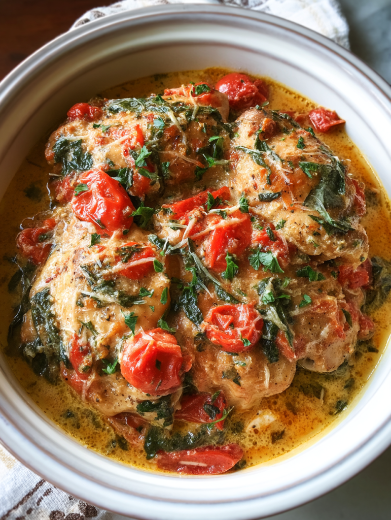 Creamy, dreamy, and packed with flavor, this Slow Cooker Tuscan Chicken is what weeknight dinner dreams are made of. Juicy chicken thighs simmer slowly in a rich garlic cream sauce with sun-dried tomatoes, wilted spinach, and a sprinkle of Italian herbs. Every bite tastes like a warm hug from Tuscany itself.