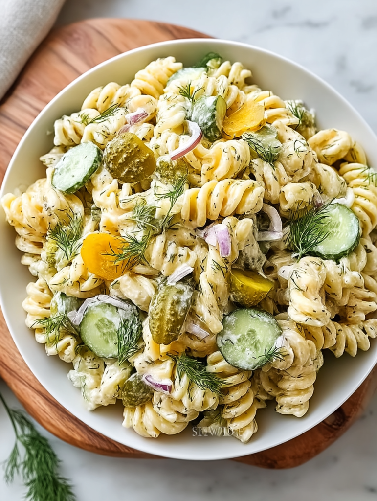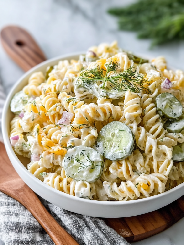 It’s more than just a side dish—it’s a conversation starter. Whether you’re serving this on a hot summer day or pairing it with grilled mains at dinner, Dill Pickle Pasta Salad delivers a satisfying crunch with bursts of dill and cheddar in every forkful.