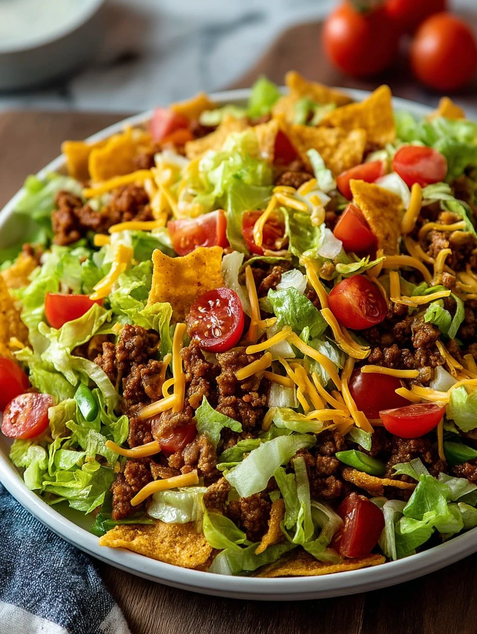 The classic Nacho Cheese Doritos are the most popular choice for this taco salad, adding a tangy, cheesy punch that contrasts beautifully with the savory beef and fresh vegetables. However, you can swap in Cool Ranch or Spicy Sweet Chili for a fun twist if you’re feeling adventurous.