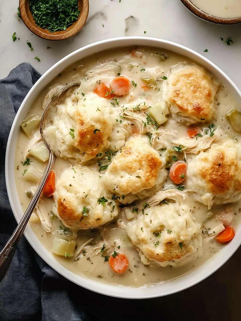 Tender shredded chicken, soft vegetables, and fluffy biscuit dumplings come together in a rich, savory broth that tastes like pure comfort in every spoonful. It is the kind of easy dinner that feels hearty enough for a chilly night but simple enough to make whenever you need a dependable family favorite.