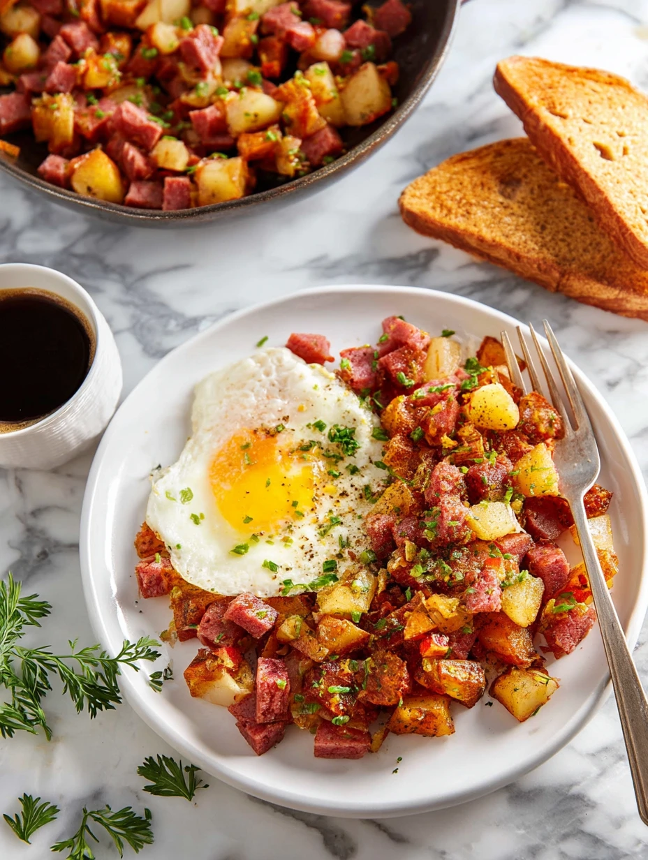 Easy Corned Beef Hash is best served hot straight from the skillet when the potatoes are still crisp and the edges are beautifully browned. This recipe comfortably feeds about 4 people as a hearty breakfast or brunch, especially if you serve it with eggs and toast on the side.