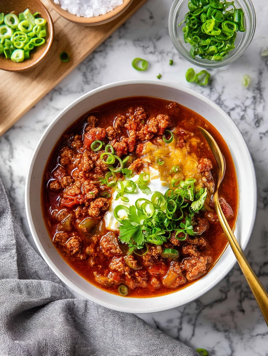 Another reason this works so well is the layering of flavor. Onion, garlic, chili powder, cumin, paprika, and a touch of heat bring that slow-cooked chili taste, while the toppings add freshness and crunch. It is proof that a bean-free chili can still taste bold, comforting, and complete.