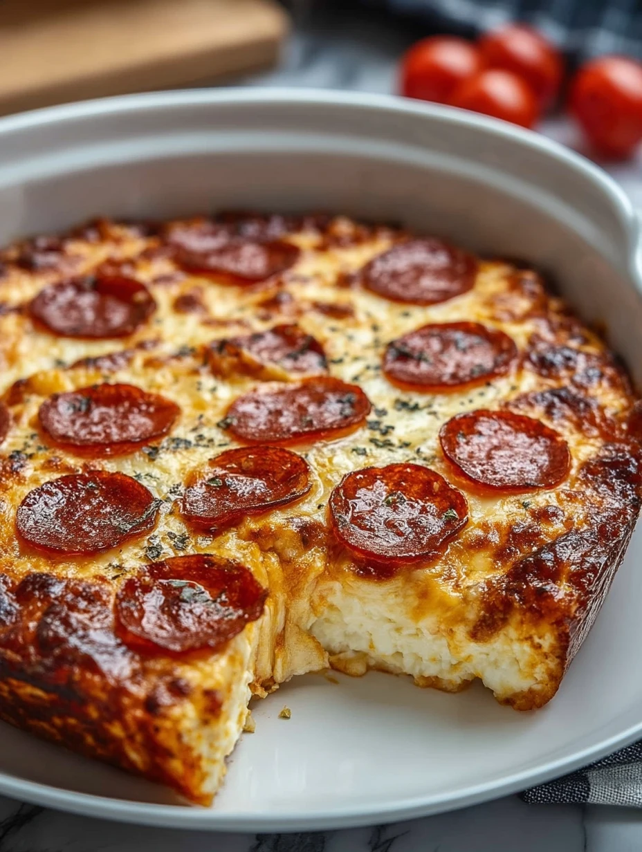 This dish is all about layers. Picture a base of seasoned cottage cheese and eggs that sets up like a fluffy, protein-rich crust, followed by a tangy pizza sauce, a generous helping of gooey mozzarella, and a final flourish of golden, crisped pepperoni slices. It comes together in minutes and bakes into a dinner that tastes like a treat but fits your busy lifestyle.