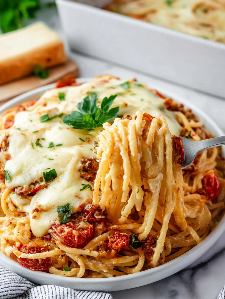 Any standard dried spaghetti will work for this recipe. You want something that holds its shape and texture after baking, so avoid angel hair or thinner pastas that might get mushy. If you prefer whole wheat or gluten-free pasta, go for it—just make sure to cook it al dente before assembling.