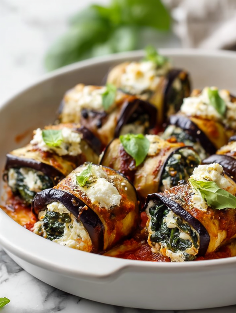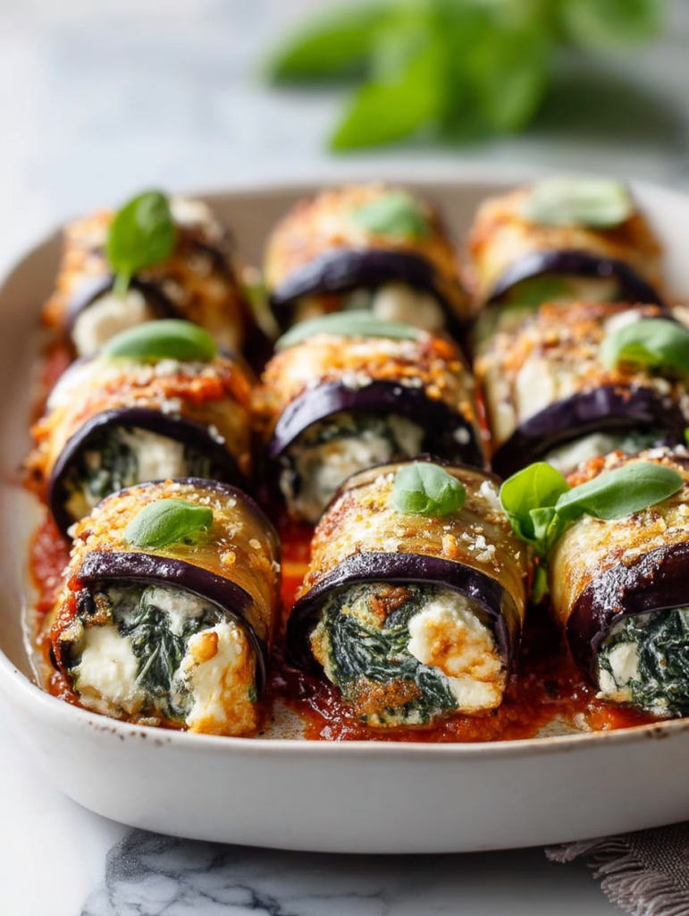 Elegant yet comforting, these Eggplant Roll-Ups with Creamy Ricotta and Spinach are the kind of dish that feels like a warm hug on a chilly evening. Layers of flavor come together effortlessly in this oven-baked recipe, where thinly sliced, roasted eggplant slices are filled with a luscious ricotta and spinach mixture, then nestled in tangy marinara and topped with Parmesan for that perfect golden finish.