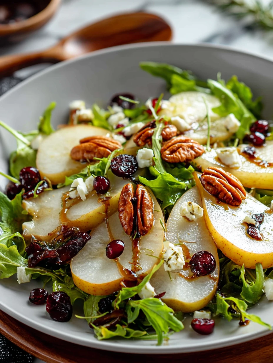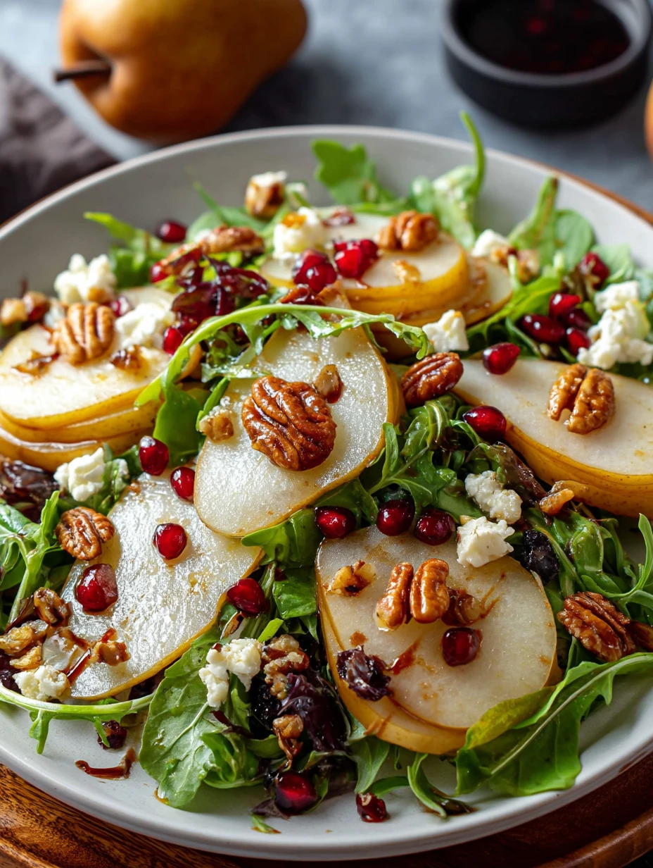 The best pears for this salad are firm yet ripe varieties like Bosc, Anjou, or Bartlett. You want pears that hold their shape when sliced thinly and don’t become mushy.