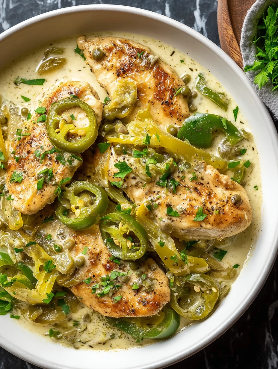 Golden-seared chicken breasts meet tangy pepperoncini and a velvety cream sauce in this Flavorful Creamy Pepperoncini Chicken Skillet. The result? A dish that wraps your tastebuds in warmth and zing with every bite. The chicken is juicy and seasoned to perfection, while the bright pepperoncini slices cut through the richness of the sauce in the most delicious way.