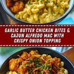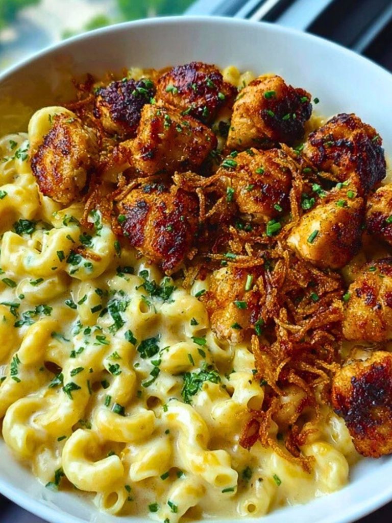 Garlic Butter Chicken Bites & Cajun Alfredo Mac with Crispy Onion Topping
