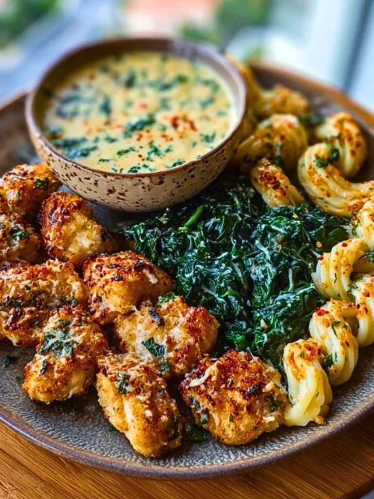 Golden, crispy, and coated in a blanket of Parmesan and garlic goodness, these chicken bites are the perfect comfort food with a bold twist. They’re paired with a creamy Hot Cajun Alfredo sauce that adds a kick of spice, balancing the richness with heat and depth of flavor. The crispy spinach twists on the side bring a fun, flaky crunch and a hint of earthy greens, making this meal both indulgent and unique.
