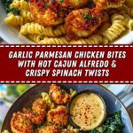 Garlic Parmesan Chicken Bites with Hot Cajun Alfredo & Crispy Spinach Twists