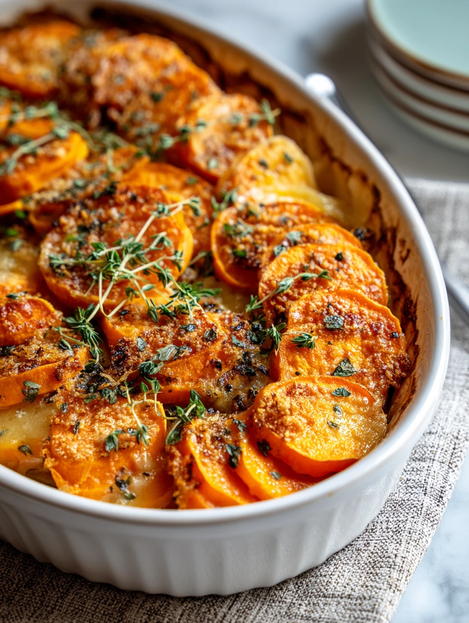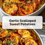 These Garlic Scalloped Sweet Potatoes are a rich, creamy, and comforting side dish layered with tender sweet potatoes, infused garlic cream, fresh thyme, and a golden Parmesan crust. Perfect for a cozy night in or an impressive addition to your holiday spread, this recipe balances sweet and savory in every bite. It’s an easy recipe that fits into dinner ideas, food ideas for holidays, or a healthy snack with indulgent flair. A great pick for quick preparation with maximum flavor impact.