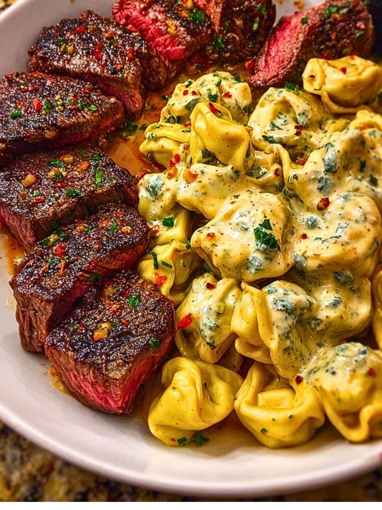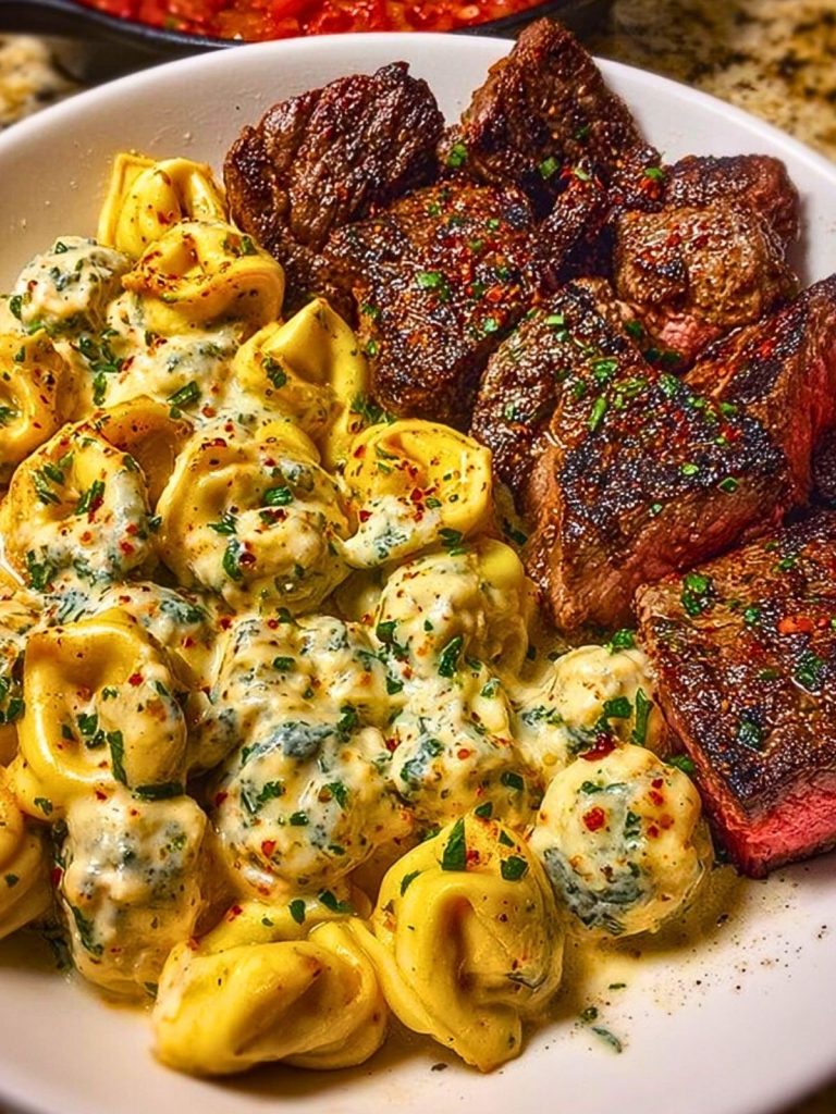 The seared steak is seasoned to perfection with a garlicky crust that locks in tenderness, while the cheese-filled tortellini soaks up the velvety sauce like a sponge. Add a sprinkle of fresh herbs and a touch of red pepper flakes, and you’ve got a cozy, comforting dish that’s as beautiful as it is delicious.