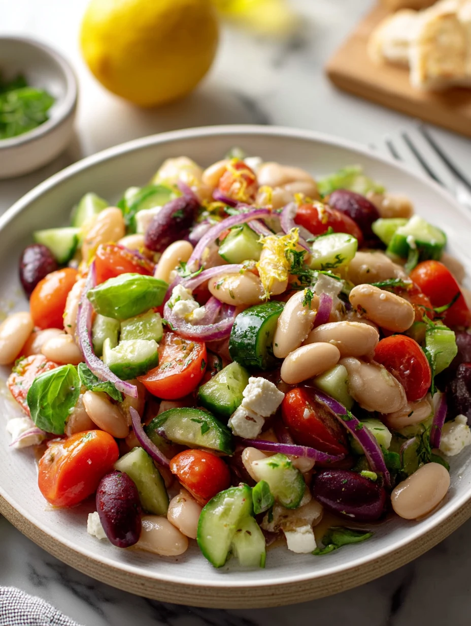 Bright, zesty, and loaded with texture, this Greek Bean Salad with Lemon Marinated Beans is a fresh, high-protein twist on classic Mediterranean salad. Creamy white beans soak in a garlicky lemon marinade, then get tossed with crunchy cucumbers, juicy tomatoes, briny olives, and salty feta for a colorful bowl that works as a quick lunch, easy dinner, or make-ahead healthy snack. It’s perfect for busy weeknights, meal prep, and anyone looking for new salad ideas and easy recipe inspiration that fits into both light dinner ideas and satisfying food ideas everyone will love.