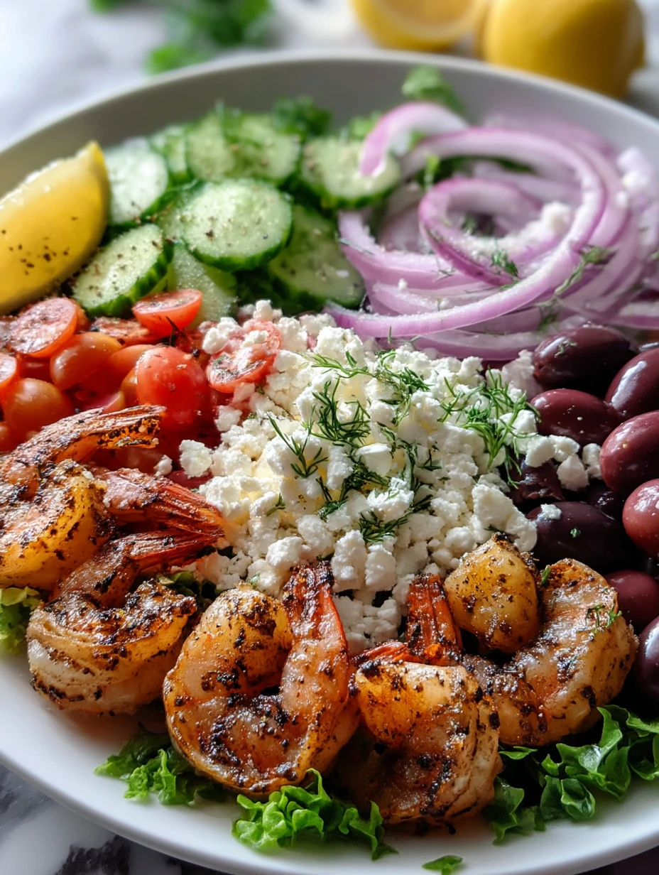 The magic comes from layering textures and bright ingredients that naturally complement one another. Shrimp soak up seasoning beautifully and cook in minutes, so they become the perfect protein for a bowl packed with fresh produce. Add briny olives, tangy feta, crisp cucumber, and juicy tomatoes, and suddenly the bowl feels rich with flavor without needing anything heavy.