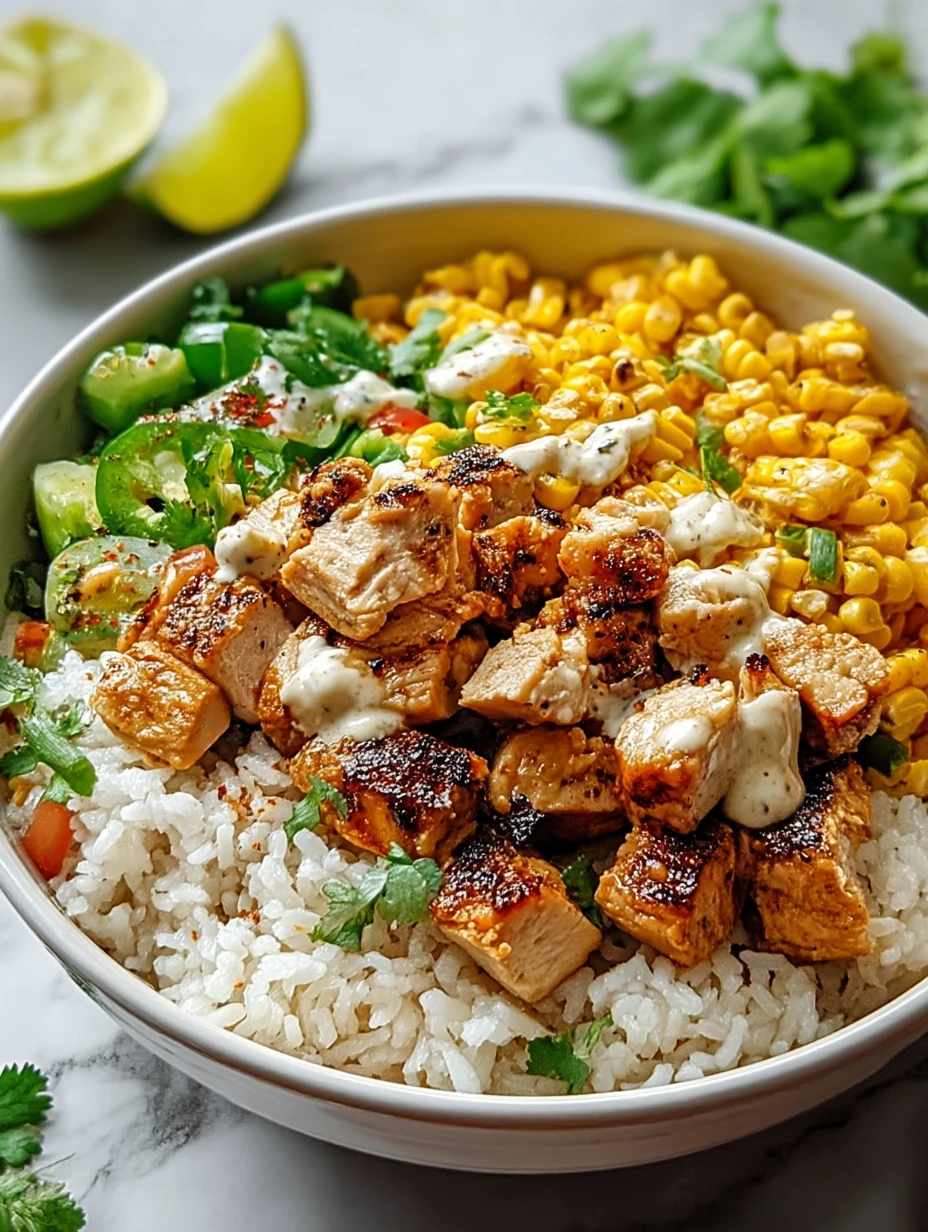Top rice with sliced chicken and street corn mixture. Drizzle Greek yogurt (thinned with lime juice) over the top. Garnish with extra cilantro or chili flakes.